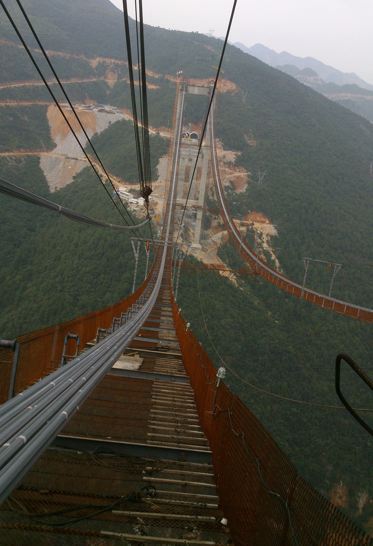 普宣高速普立特大桥,桥长1290米,主桥628米,为双塔单跨钢箱梁悬索桥。该桥采用250吨缆索起重机进行钢梁架设,并首次应用公司研发的旋转吊钩对构件空中姿态进行自由调整,为山区悬索桥开辟了新的钢梁架设方法。