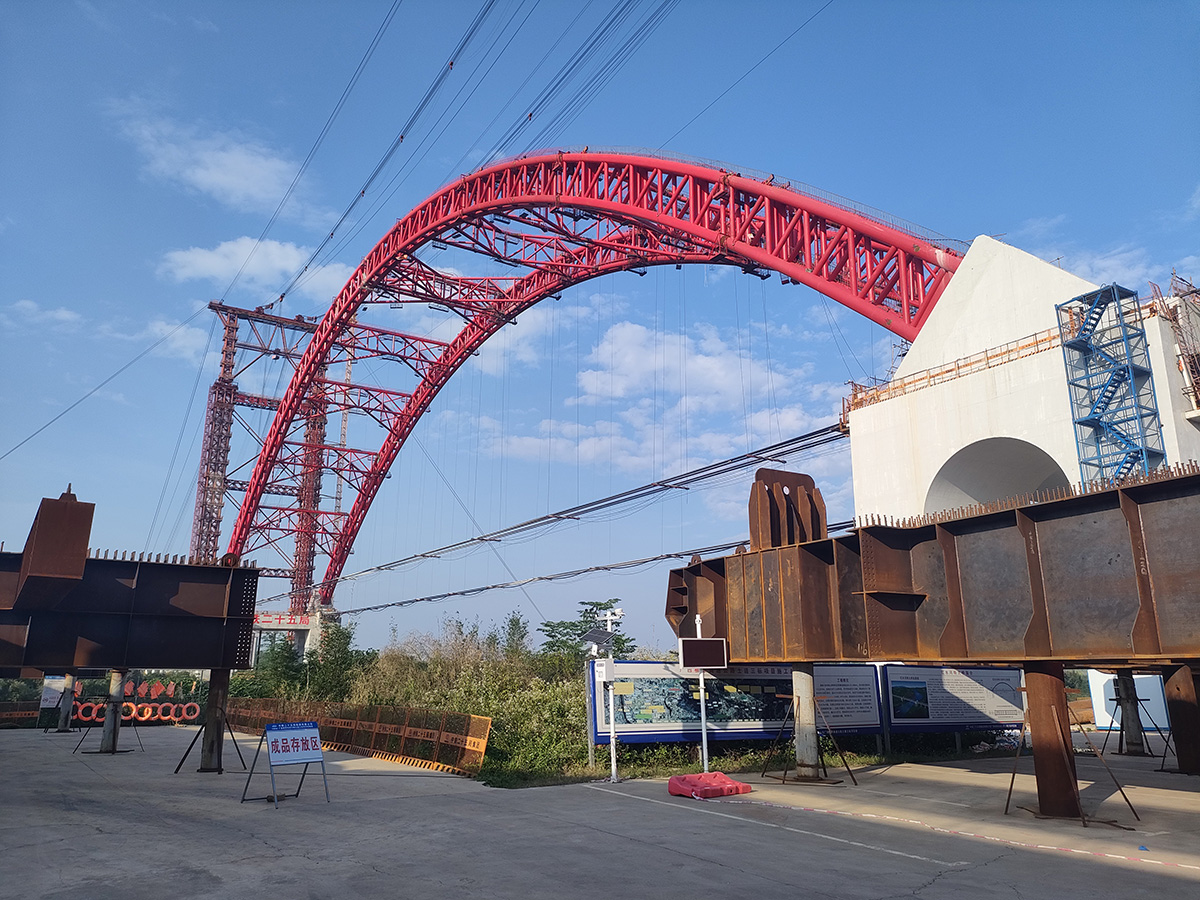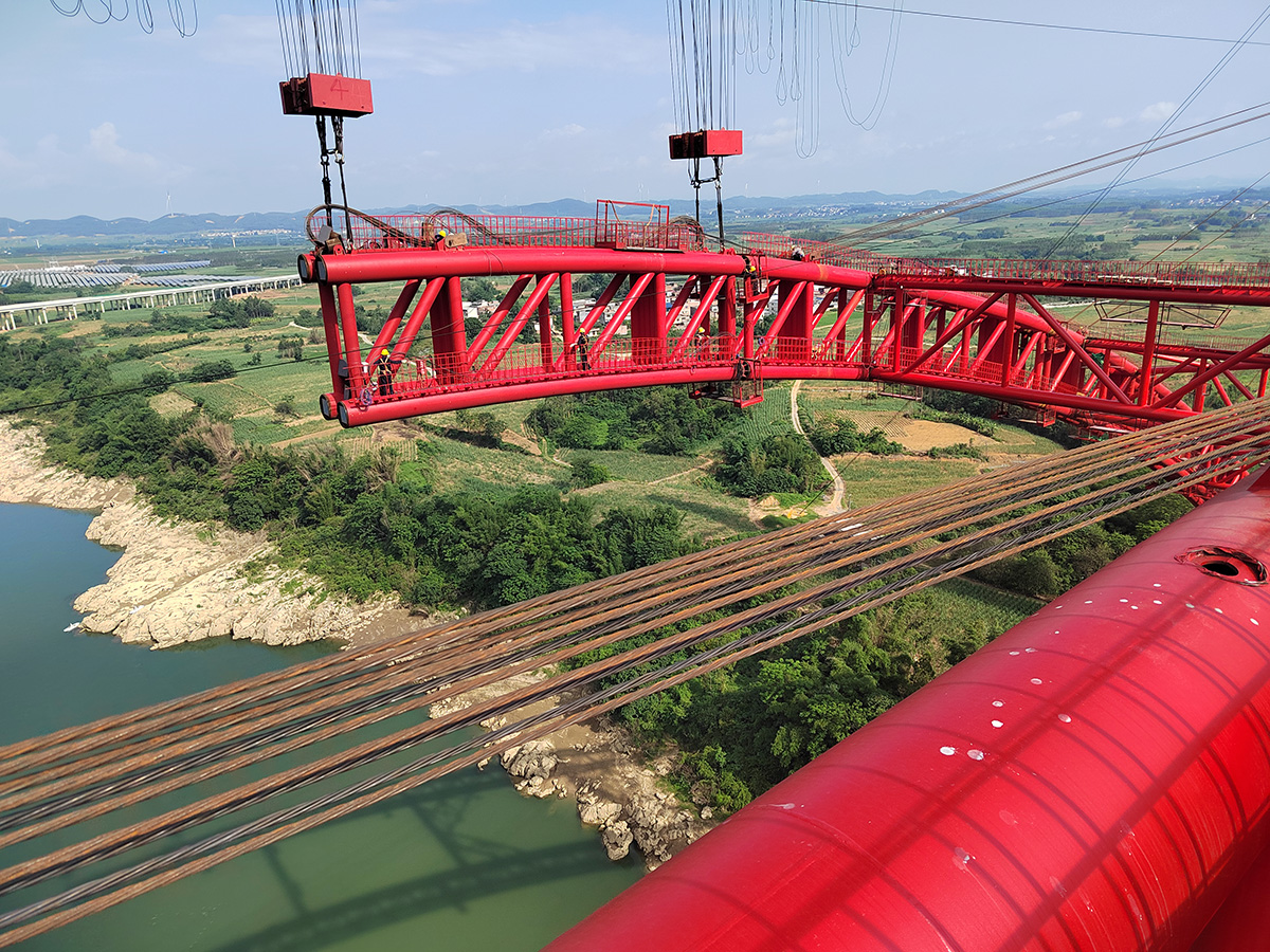 该桥为主跨285米的下承式系杆拱桥,全长1732米,采用2×55t缆索起重机进行安装,2025年6月16日合龙。
