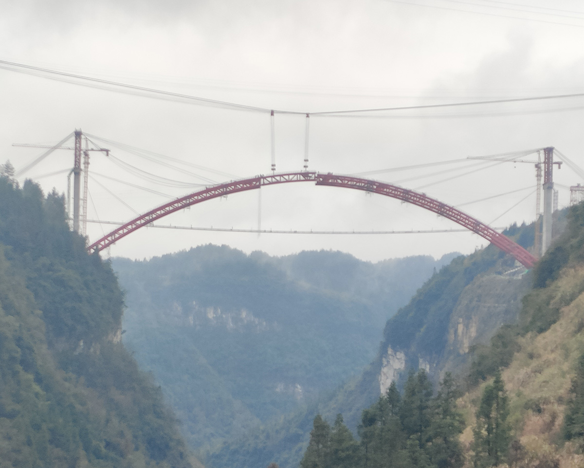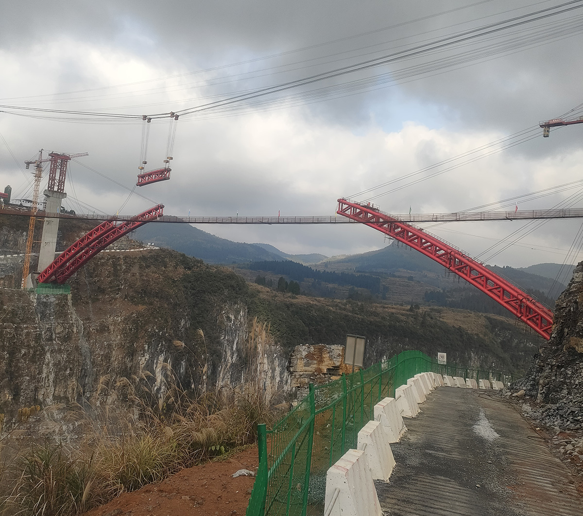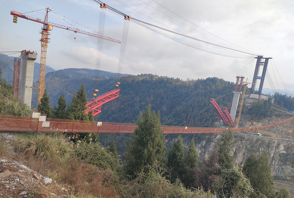 该桥为主跨252米的上承式钢管混凝土拱桥,全长412米,是湖南省S253保靖迁陵至夯沙公路控制性工程,采用2×55t缆索式起重机进行安装,2024年1月25日合龙。