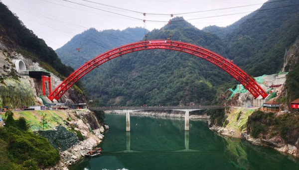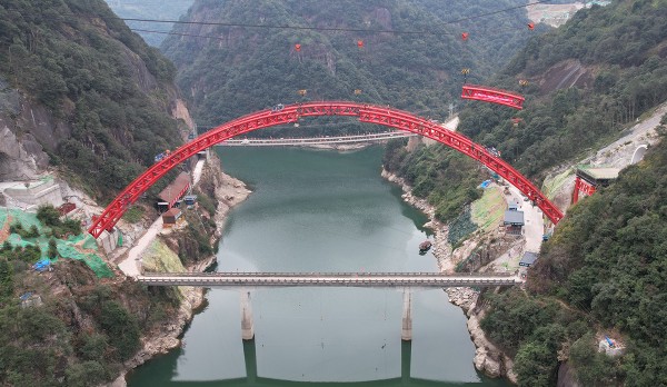 该桥为主跨152米的中承式钢管混凝土拱桥,全长191.52米,采用2×40t缆索起重机进行安装,2024年12月25日合龙。